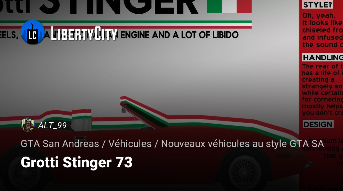 Grotti Stinger 73 — une voiture de sport classique à deux portes. Malgré les années, ce modèle ancien offre de bonnes performances. C'est parfait pour une balade le long de la côte.