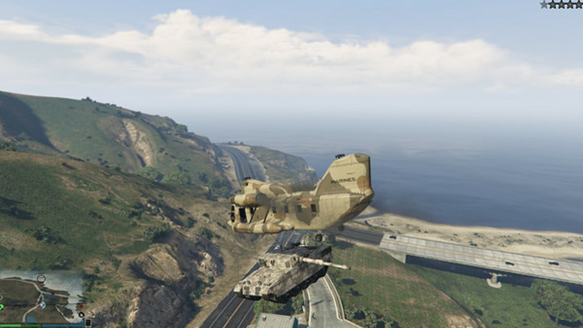 Une fois que vous avez trouvé le Cargobob, entrez dans le cockpit et décollez immédiatement, puis trouvez le tank le plus proche et le plus approprié et accrochez-le avec l'hélicoptère. Dès que le Rhino est attaché, soulevez-le dans les airs et quittez le territoire de la base. Attendez que les étoiles de recherche disparaissent, après quoi vous pouvez laisser le tank au sol et entrer dans son cockpit.
